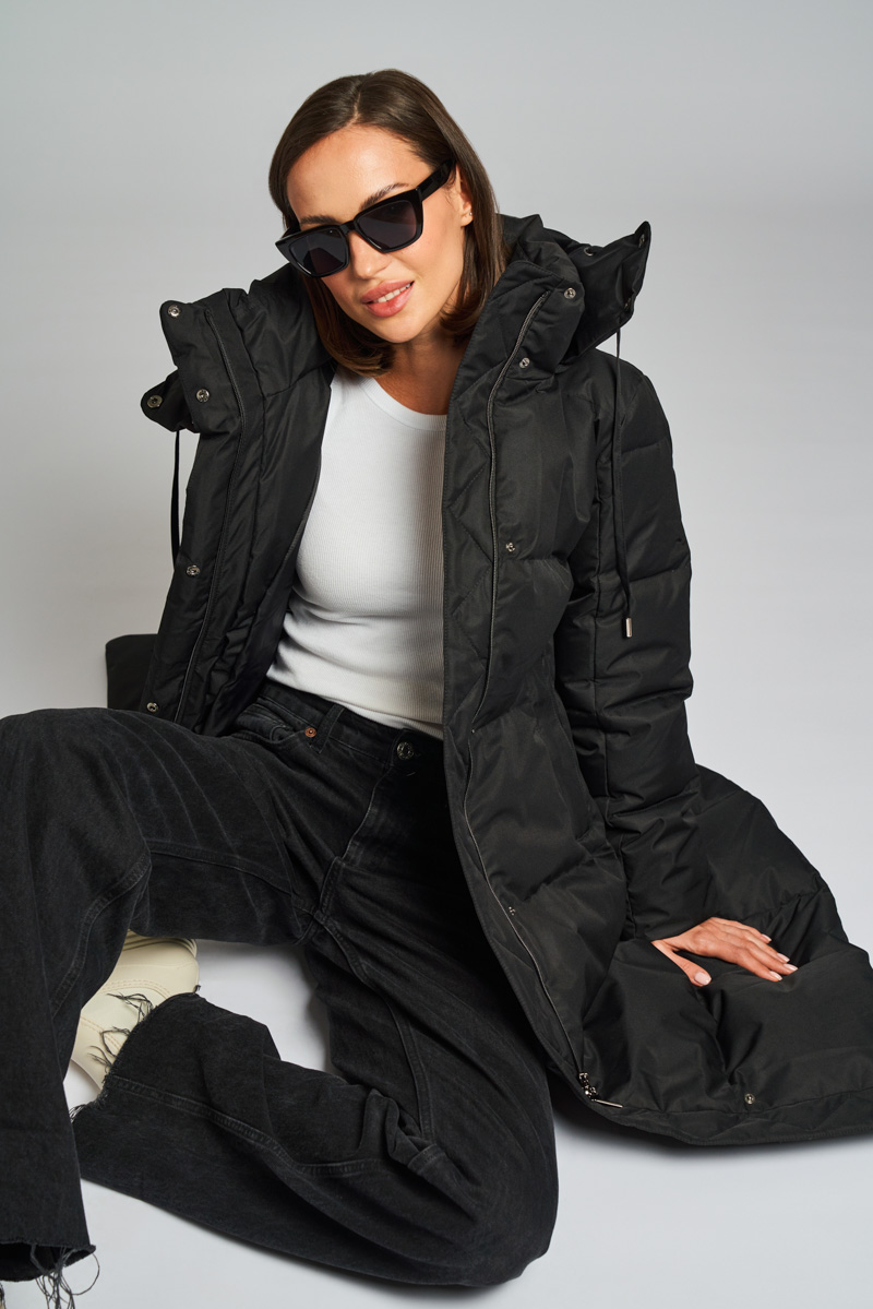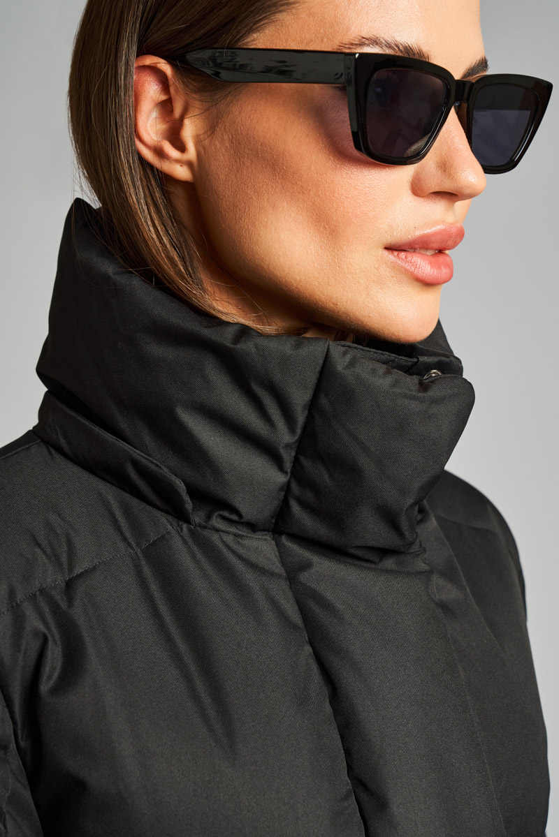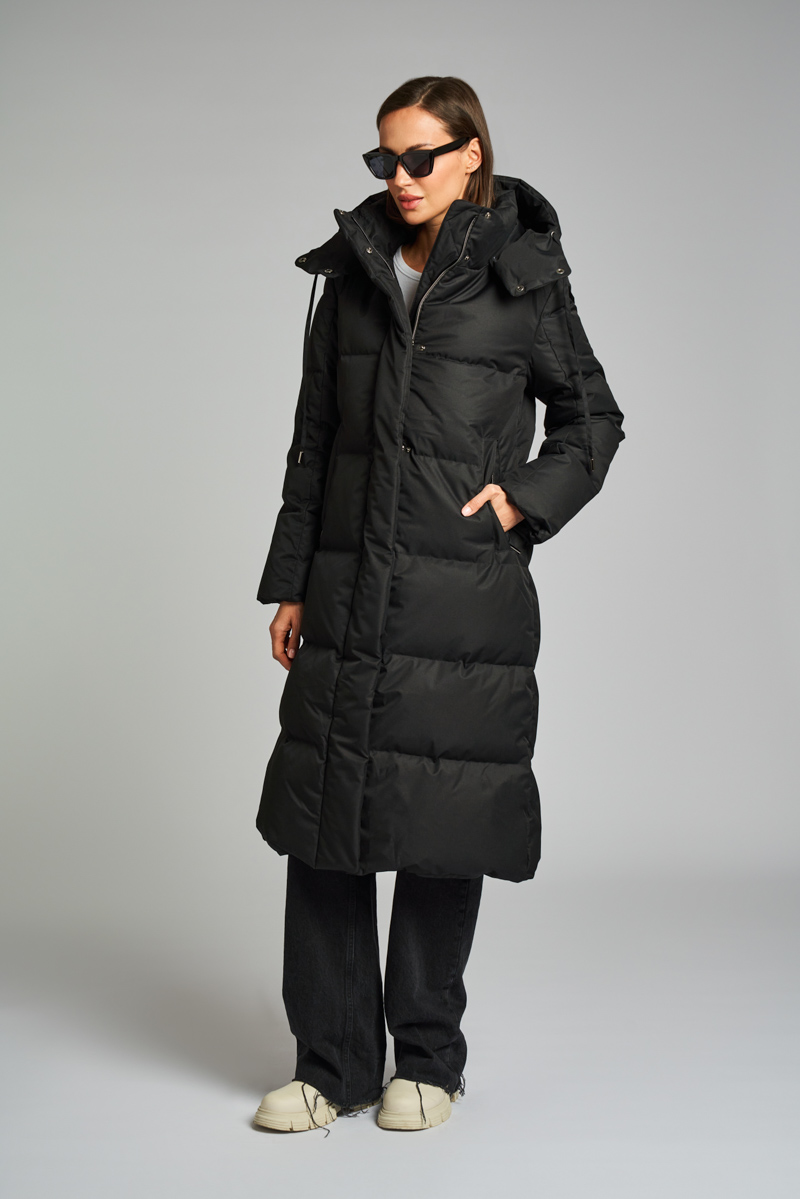 Пуховик женский, рассчитан на зимний сезон. Изготавливается из плащевой ткани. Полочка изделия минималистичная, простроченна горизонтально на 7 сегментов. Спинка изделия так же прострочена, сзади расположены рельефы. Силуэт изделия полуприлегающий. Рукав втачной, небольшого объема. Воротник изделия- стойка. Карманы прорезные на молнию. Застежка пуховика на молнию и планку с кнопками. У изделия присутствует съемный капюшон.