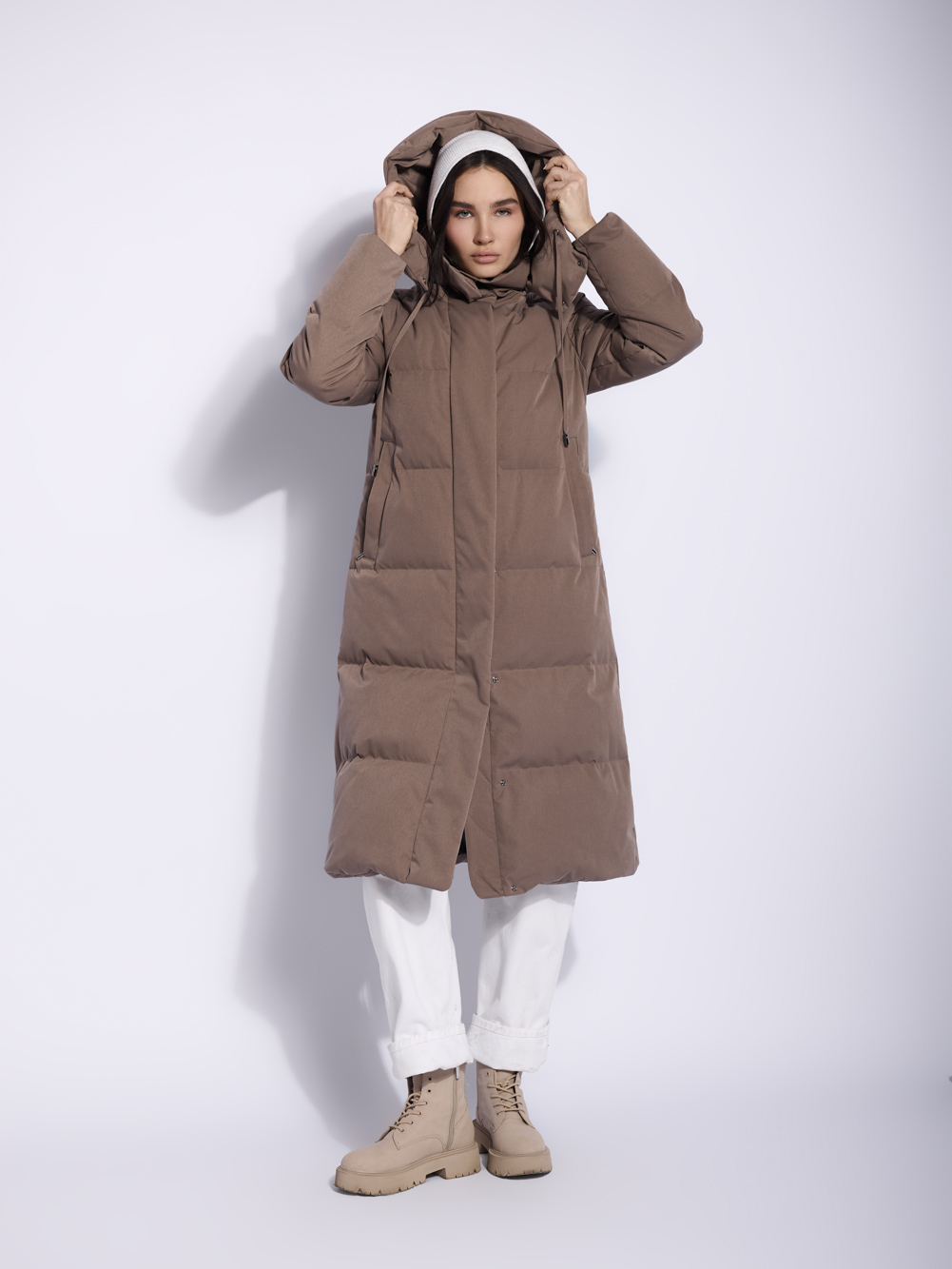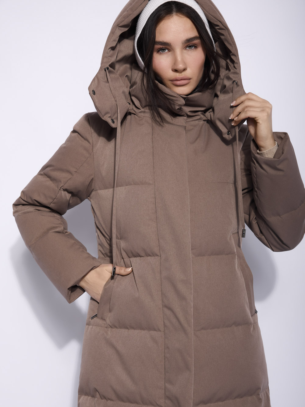 Пальто-пуховик, в котором ваши стильные образы станут еще и теплыми! Изделие с водоотталкивающей пропиткой и съемным капюшоном, который защитит макияж и укладку от ветра и снега, создано для переменчивой зимней погоды. Полуприлегающий силуэт сохраняет пропорции фигуры и отлично удерживает тепло во время долгих прогулок. Чтобы вы могли спокойно забыть шапку и шарф дома, мы добавили воротник стойку и кулиску на капюшон для плотного прилегания. Удобная длина в 110 см подойдет для активного отдыха и жизни без оглядки на холод.