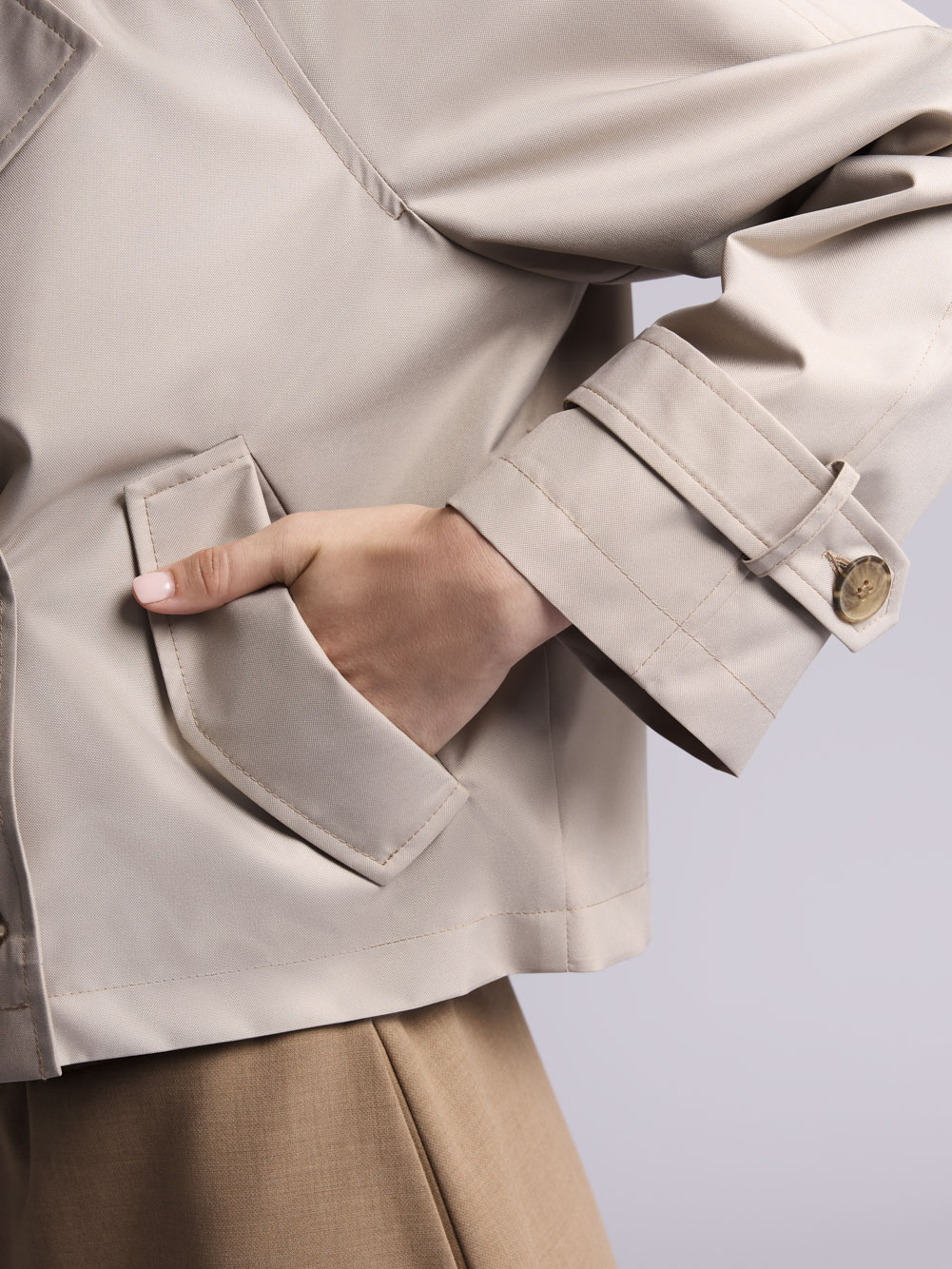 Короткий плащ подчеркивает длину ног и вдохновляет на утонченные образы. Куда бы вы ни пошли, от непогоды защитит водоотталкивающая пропитка на ткани изделия.